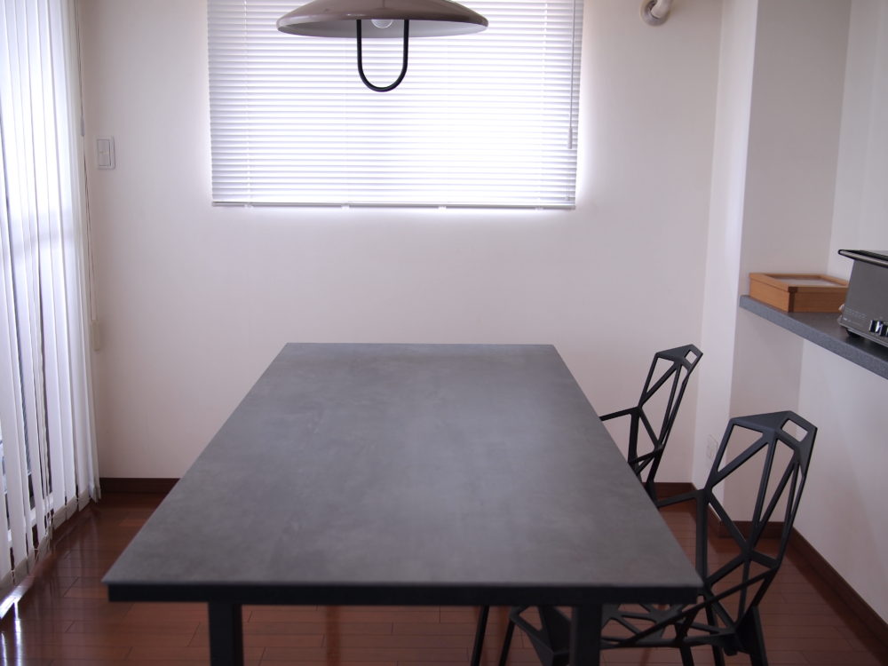 このテーブルがかなり男前で、天板がスペイン製のセラミック。 特徴は、高い耐熱 耐摩耗性だとか。 熱々鍋が直接乗っても、金属のフライパンで擦っても平気だそうです。 怖くてまだ試してませんが、、、 しかもこのセラミック、100%天然素材で無害。 ホント男前。