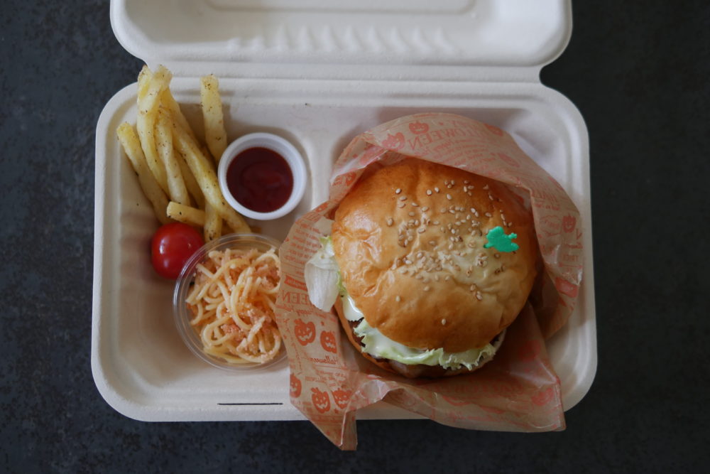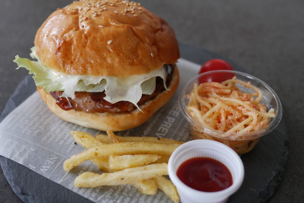 紙製の固いボックスにテリヤキバーガーとフライドポテト、カップにタラコパスタ